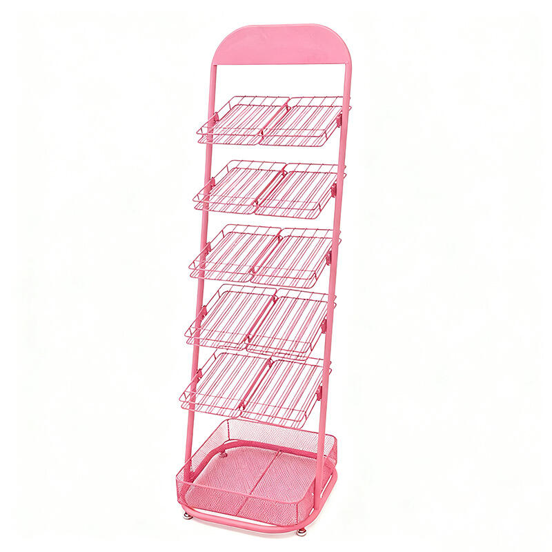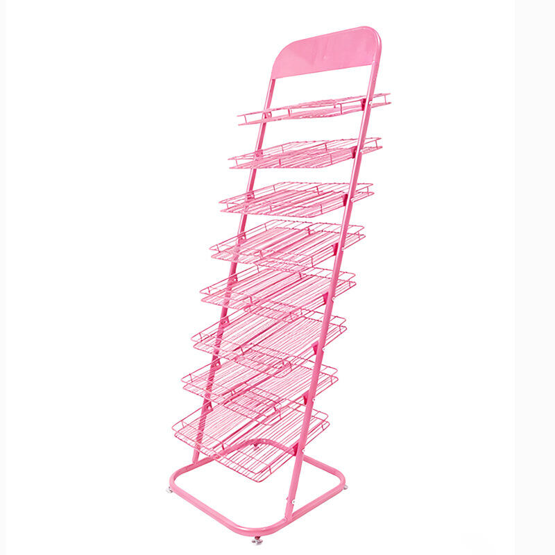 Display stands and shelves made of wire: nail polish racks, snack storage racks, and beauty & skincare product shelves