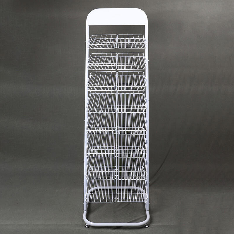 The enclosed wire basket at the bottom provides space for backup inventory or promotional materials, making full use of vertical space and improving overall space efficiency.